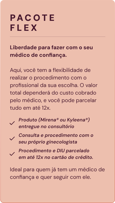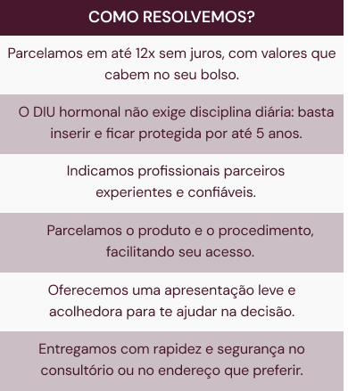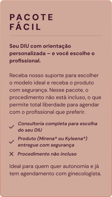Optamos por trabalhar apenas com o DIU hormonal porque ele oferece mais conforto e qualidade de vida no dia a dia: fluxo reduzido, menos cólicas e alta eficácia. O DIU de cobre, embora eficaz, pode intensificar sintomas que muitas mulheres buscam evitar — e nosso compromisso é oferecer soluções que respeitem seu corpo, sua rotina e suas escolhas.