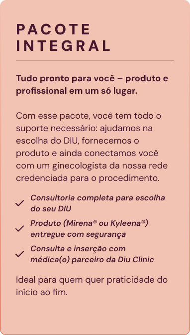 A Diu Clinic nasceu para tornar o acesso ao DIU hormonal mais simples e acessível. Sabemos que escolher um método contraceptivo envolve dúvidas, custo e, muitas vezes, falta de apoio. Por isso, oferecemos uma experiência completa — com consultoria personalizada, marcas reconhecidas como Mirena® e Kyleena® e pagamento facilitado em até 12x.